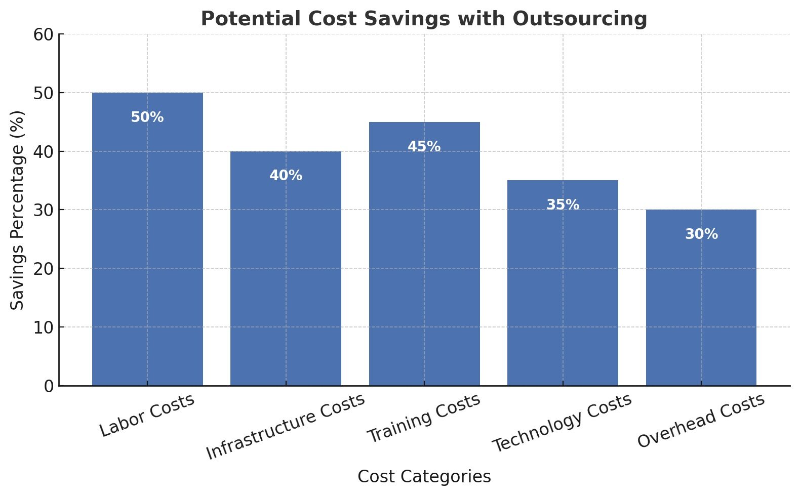 يوضح الرسم البياني التالي أبرز مجالات التوفير التي يمكن أن تحققها الشركات عند التعهيد، وخاصة شركات outsourcing في مصر. وتشمل هذه المجالات تكاليف العمالة، والبنية التحتية، والتدريب، والتكنولوجيا، والمصاريف التشغيلية، حيث يمكن أن تصل نسبة التوفير في بعض الفئات إلى 50%، مما يجعل التعهيد خياراً استراتيجياً لتعزيز الكفاءة وتقليل النفقات.